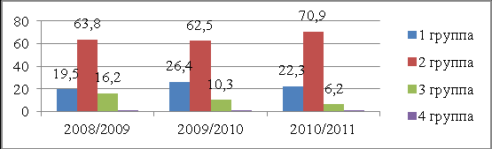 Диаграмма 6. Сведения о распределение школьников по группам здоровья за 2008-2011 гг.