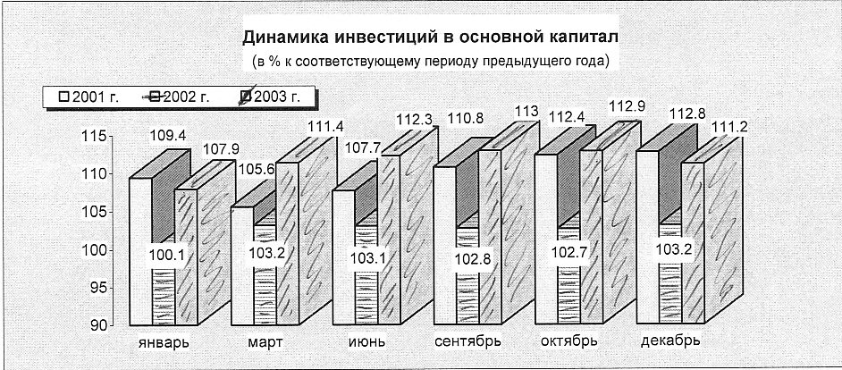 Отличительной чертой развития инвестиционной сферы в 2003 году стал значительный рот инвестиционной активности по сравнению с 2002 годом. В январе-октябре 2003 года инвестиции в основной капитал выросли на 12,2% относительно соответствующего периода 2002 года.