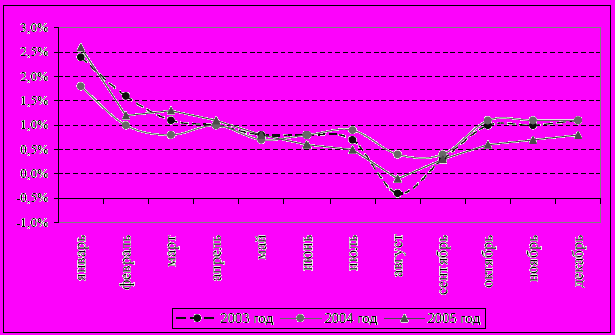 Итак, начиная со II полугодия 2005 г., судя по всему, начинает формироваться нисходящая тенденция прироста потребительских цен в годовом выражении. На фоне плавного снижения и последующей стабилизации (июль-август т.г.) прироста цен на непродовольственные товары, а также прекращении роста цен (в годовом выражении) в сфере платных услуг населению, резкое их снижение на продовольственные товары привело к образованию указанной тенденции по ИПЦ (индекс потребительских цен) в целом.