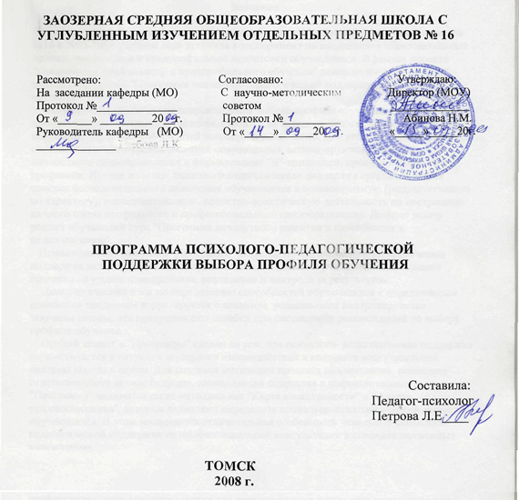 Заозерная общеобразовательная школа с углубленным изучением отдельных предметов №16 в 2003-2004 учебном году вступила в эксперимент по внедрению в образовательный процесс профильной и предпрофильной подготовки обучающихся. В рамках проекта "Организация профильного и предпрофильного обучения" психологической службой школы разработана "Программа психолого-педагогической поддержки выбора профиля обучения".