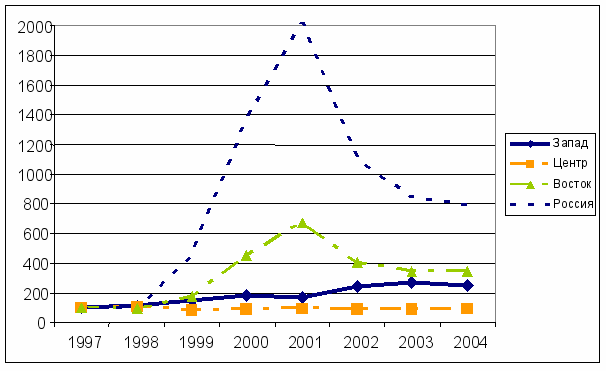 График 1. Сводные данные по распространению ВИЧ инфекции с разбивкой по географическим зонам, полу и группе распространения заболевания в 2004 г.