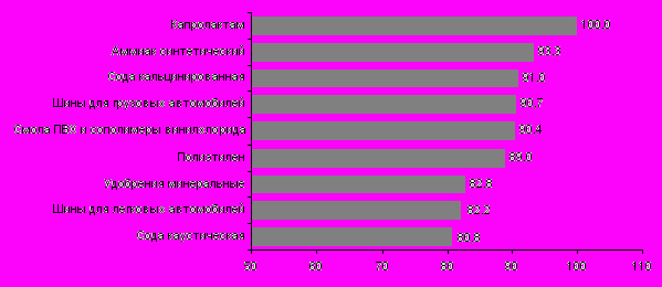 Рис. 10. Загрузка мощностей по отдельным видам химической и нефтехимической продукции в 2006 г., %. (Источник: Росстат; расчеты)