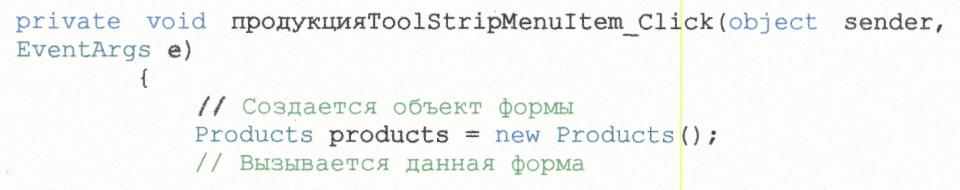 22. При двойном нажатии на одном из введенных пунктов меню открывается код формы, а в нем обработчик события. В нем следует прописать связь основной формы с вызываемой. Это делается таким образом: