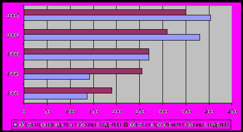 При емкости рынка 350 млрд штук табачных изделий в 2005 году их производство составило 400 млрд штук. Опережающий рост производства табачных изделий свидетельствует, что действующая система акцизного обложения не выполняет одну из основных своих функций – ограничения объема спроса, а на этой основе и предложения данного товара. Фискальные интересы государства явно превосходят его интересы в снижении угроз здоровью населения от потребления табачных изделий. При этом используются традиционные методы – рост акцизов в цене товара, что стимулирует потребление менее качественной, а потому и наиболее негативно отражающейся на здоровье населения продукции. Целевое использование части акцизных доходов для финансирования комплексных программ по сокращению потребления табачных изделий находится в числе тех резервов, которые Российское государство пока еще не использует, предпочитая действовать запретительными ограничениями, что приносит незначительный эффект, если судить на основе роста потребления данного вида продукции.