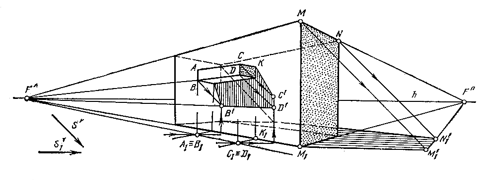 Метод архитекторов представляет собой совместное использование точек схода, картинных следов прямых, масштабов высот и линий пересечения горизонтально проецирующих лучевых плоскостей с картиной (рис. 27).