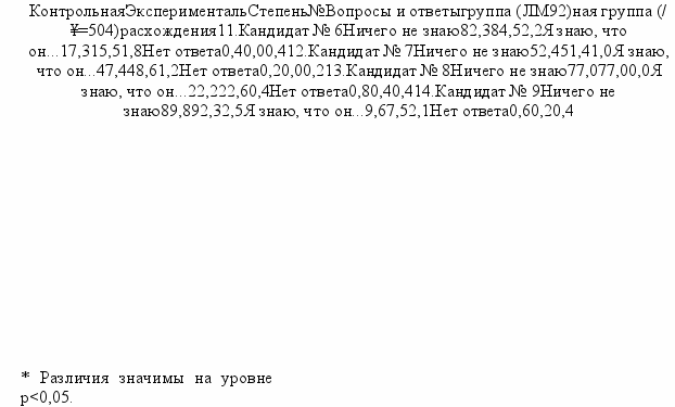 Анализ данных, полученных по 14 содержательным вопросам в контрольной и экспериментальной группах, показывает, что лишь по трем из 68 сравниваемых пар ответов имеются статистически значимые различия по критерию углового преобразования Фишера, в то время как в подавляющем большинстве сравнений они отсутствуют. Максимальные расхождения, обнаруженные в вопросах №№ 4 и 7, не превышают 4%, составляя 3,7% и 3,8%), соответственно (табл. 64).