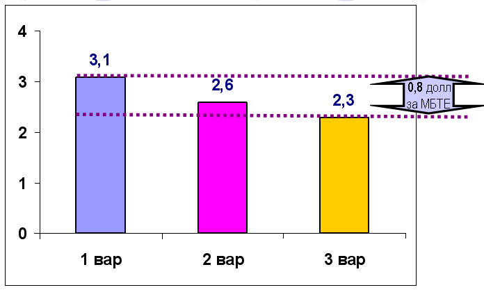 | | 1 фаза проекта 2013-2018 гг. | 2 фаза проекта 2018-2021 гг. | 3 фаза проекта 2021 -… гг. | Стоимость реализации различных вариантов, $/MBTU |