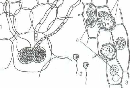 1 – зооспорангии в клетке хозяина; 2 – зооспоры, 3а – протопласты и