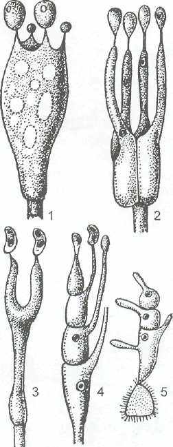 1 – холобазидия; 2-4- гетеробази-дии; 5 - телио- (фрагмо) базидия