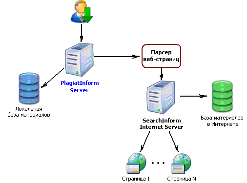Карыснаю для даследчыка стане сістэма “Плагиат-Информ”, распрацаваная расійскай кампаніяй “СофтИнформ” [6]. Сістэма правярае атрыманы тэкст паралельна па дзвюх базах матэрыялаў – па лакальнай базе, дзе могуць захоўвацца здадзеныя матэрыялы і алічбаваныя друкаваныя выданні, і па базе матэрыялаў, сабраных з Інтэрнэту. Інтэрнэт-база абнаўляецца наступным чынам: SearchInform Internet Server адкачвае з сеціва з зададзенай перыядычнасцю пазначаныя карыстальнікам дамены (старонкі) і складуе іх. Парсер вэб-старонак вымае з гэтых старонак толькі інфарматыўны тэкст, не зважаючы на розныя меню, рэкламныя блокі і іншае інфармацыйнае смецце.