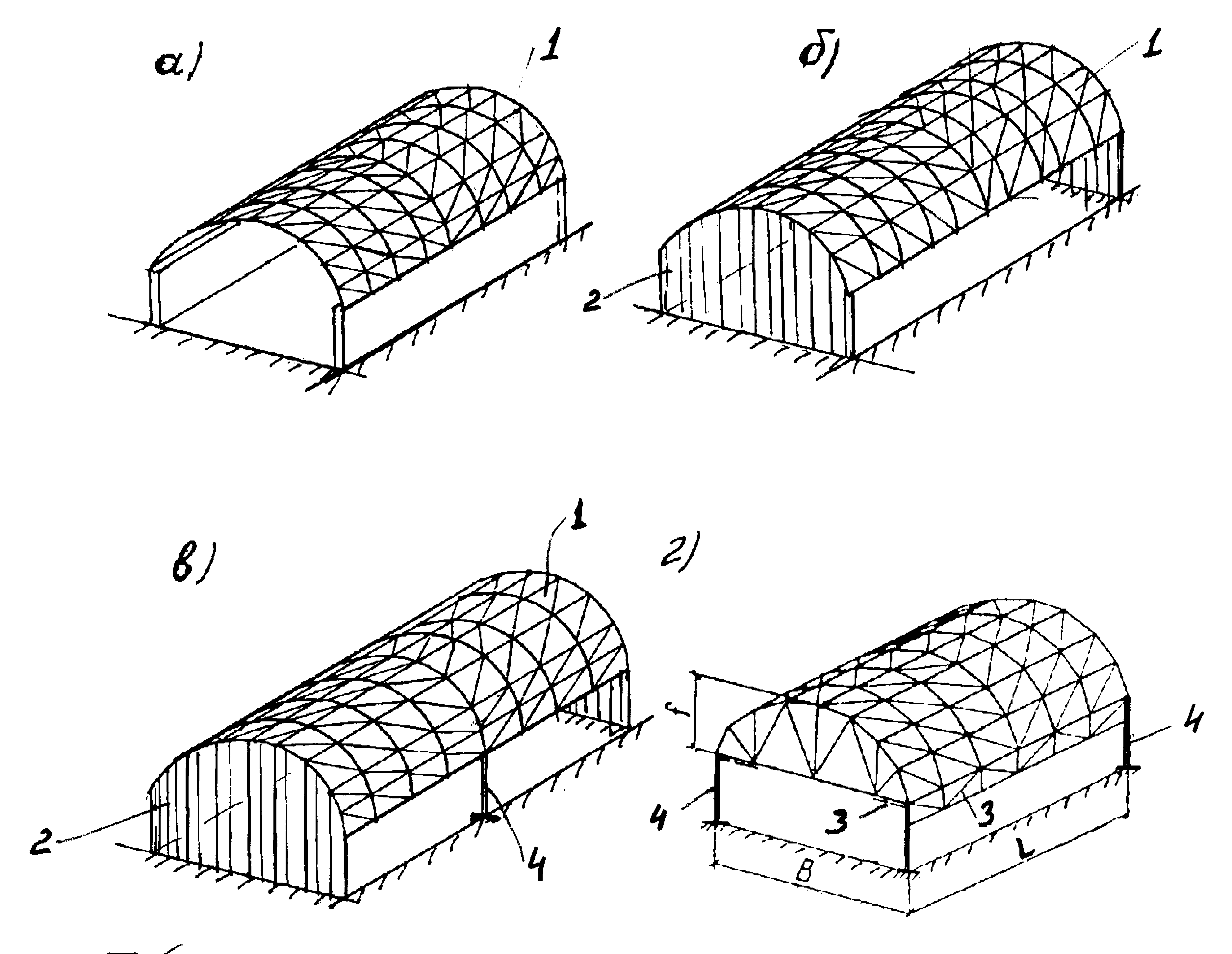 Жёсткость конструкции значительно увеличивается при наличии продольных стержней (схема "б") — конструкция может работать как оболочка пролётом L. В этом случае опорой могут служить торцовые стены или четыре колонны с торцовыми диафрагмами.