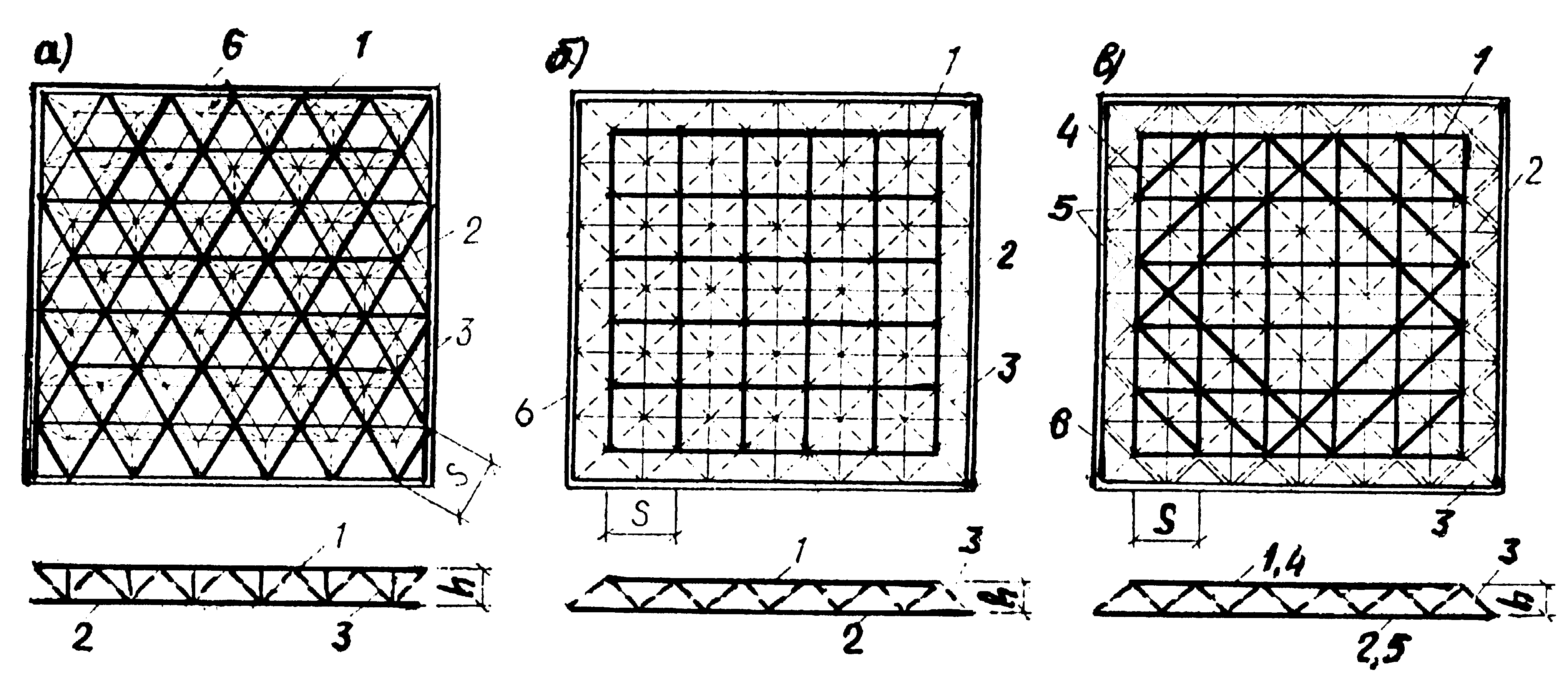 Рис. 6 - Схемы решёток структурных покрытий (а — с поясными сетками из равносторонних треугольных ячеек; б — с поясными сетками из квадратных ячеек; в — то же, усиленных диагоналями в условных зонах: 1 — верхние пояса,