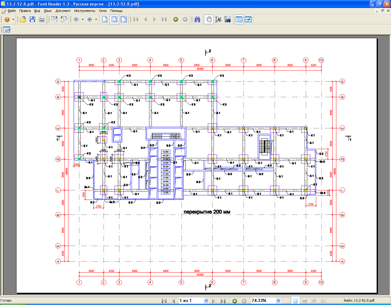- типовых этажей с 4 по 15. Габаритные размеры 65,4х32,2м, толщина перекрытия 200мм;