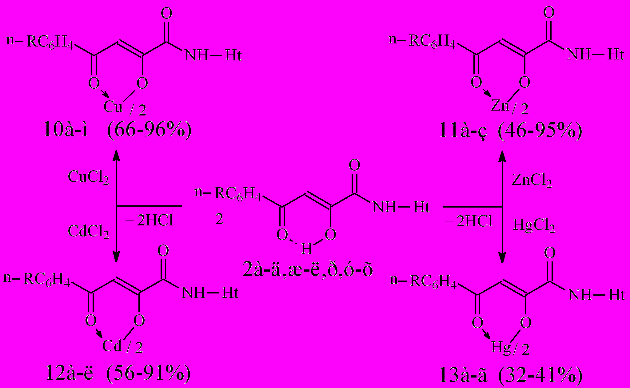 Нами установлено, что N-гетериламиды 2а-д,ж-л,р,у-х взаимодействуют с дихлоридами меди, цинка, кадмия, ртути в соотношении лиганд-металл 2:1 в мягких условиях, в среде спирта этилового с образованием бис[3-арил-1-(N-гетерил)карбоксамидо-1,3-пропандионато] меди (10а-м), цинка (11а-з), кадмия (12а-л) и ртути (13а-г):