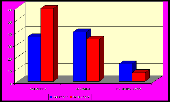 В ходе опроса установлено, что постоянно используют в разговорной речи сленг 59% учащихся 9-10 классов и 36 % учащихся 7-8 классов. Кроме того, 14 % учащиеся 7-8 классов стараются не использовать сленг в разговорной речи, тогда как среди учеников 9-10 классов не используют сленг только 7%. Я думаю, это связано с тем, что наибольшее влияние на подростков 9-10 классов оказывает круг друзей и знакомых, а для учеников 7-8 классов референтной группой является семья (рис. 5).
