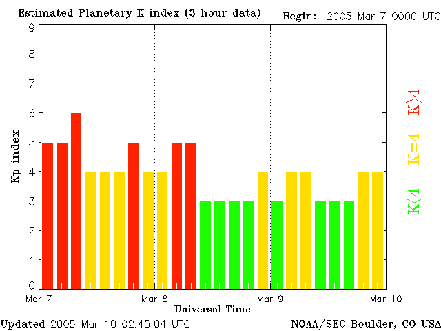 Рис. 3 Диаграмма планетарного Kp индекса по данным всемирной сети геомагнитных станций в 3х часовом режиме оценки в течении 3х суток.