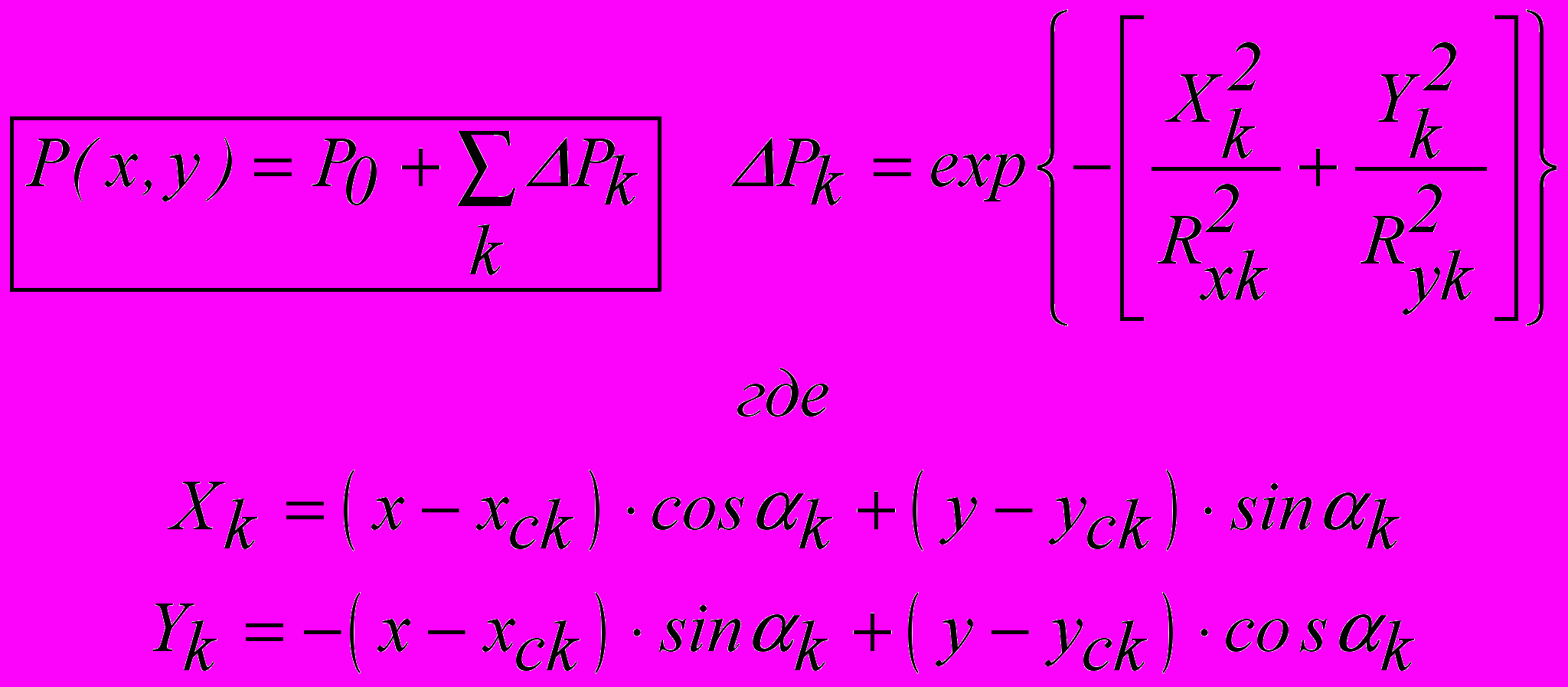 (3.1)В них обозначены: x , y – координаты точки, для которой производится расчет значения давления (они меняются от точки к точке); P0 –одинаковое для всех точек значение среднего давления; ΔPk – разность давления в центре с номером k и среднего давления P0 (положительна, если центр с номером k является антициклоном, и отрицательна для циклона); xck , yck – координаты центра с номером k ; αk –угол наклона главной оси эллиптичности центра с номером k относительно оси OX исходной системы координат.