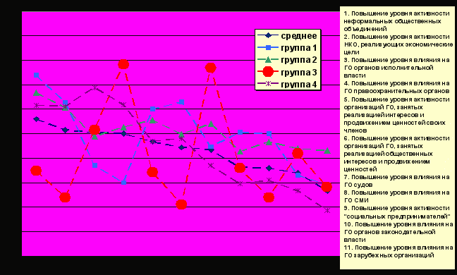 При этом эксперты первой группы дают высокие средние оценки вероятности таким явлениям и процессам, которые следует признать позитивными для развития гражданского общества России (например, повышение уровня социально-политической активности граждан; улучшение состояния коммуникативной среды в обществе) и низкие оценки тем событиям, которые для него неблагоприятны (например, повышение уровня влияния на ГО правоохранительных органов; повышение уровня доминирования государства в развитии организаций ГО).