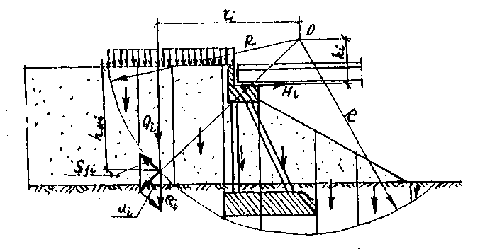 Задаются произвольной цилиндрической поверхностью радиуса R с центром в т. 0 (рис. 6.15). Отсеченный объем разбивают на 7-10 участков длиной li, вычисляют веса Qi участков (включая элементы опоры, попадающие на отдельные участки, вес временном нагрузки на мосту и подходах и опорные реакции от пролетных строений) и плечи ri (расстояние от центра тяжести i-го участка до т. 0).
