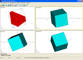 В программе используются три окна проекции: вид сверху, вид слева, вид спереди, перспектива. Размер окон проекции изменяется путем перемещения цента разделителя. Также здесь показаны оси координат. Существует возможность включения координатной сетки.
