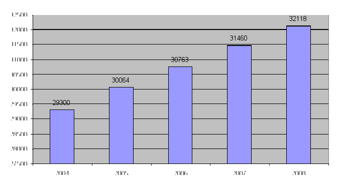 Параллельно с ростом числа мест количество детей в дошкольных учреждениях также имеет тенденцию к росту. С 2004 по 2008 год число детей в дошкольных учреждениях увеличилось на 2818 человек (рис. 4.12).