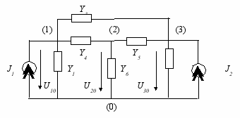 Узловым током Ji0 i-го узла называется алгебраическая сумма токов всех источников тока, подключенных к данному узлу. Если ток какого-либо источника тока направлен к i-му узлу, то он входит в Ji0 со знаком плюс, если ток направлен от i-го узла, то он входит со знаком минус. Для рассматриваемой цепи