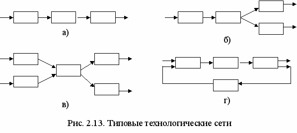 5. Выделение стадий производства конечного продукта, соответствующих технологически законченным процессам. В работе [9] выделены типовые элементы, из которых конструируются реальные технологические сети (см. рис. 2.13):