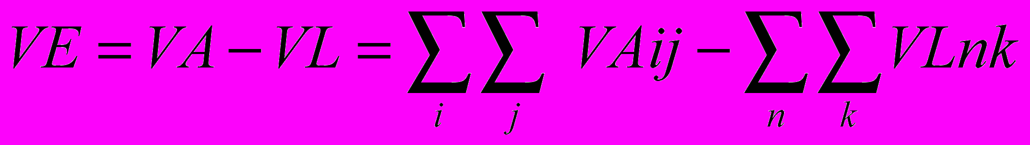(6.1)где: ij – индексы суммирования рыночных оценок по активам, I – индексы групп активов – кредиты, ценные бумаги, корсчета и т.д., j- индексы суммирования оценок внутри каждой группы I по видам вложений и клиентам, например внутри группы кредиты стоимость кредита компании 1, стоимость кредита компании 2….стоимость кредита компании j; аналогично nk - индексы суммирования оценок по пассивам.