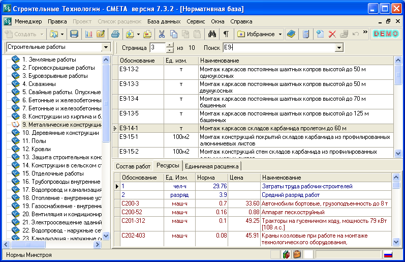 - просмотр нормативных сборников, быстрый поиск расценок и связанных с ними ресурсов;