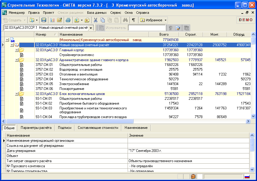 На рисунке представлено отображение структуры проекта «Реконструкция Кременчугского автосборочного завода». В окне отображается перечень объектных и локальных смет, входящих в состав проекта, с результатами их расчета. Результаты расчета проекта формируются программой автоматически по мере создания проекта и установки правил его расчета.
