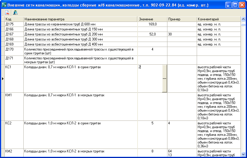 Пользователь указывает длину трасы, количество присоединений прокладываемой трасы к существующей трассе, количество колодцев соответствующего диаметра и марки, количество люков и т.д. В результате применения указанных параметров программа автоматически формирует фрагмент локальной сметы, представленный на рисунке.