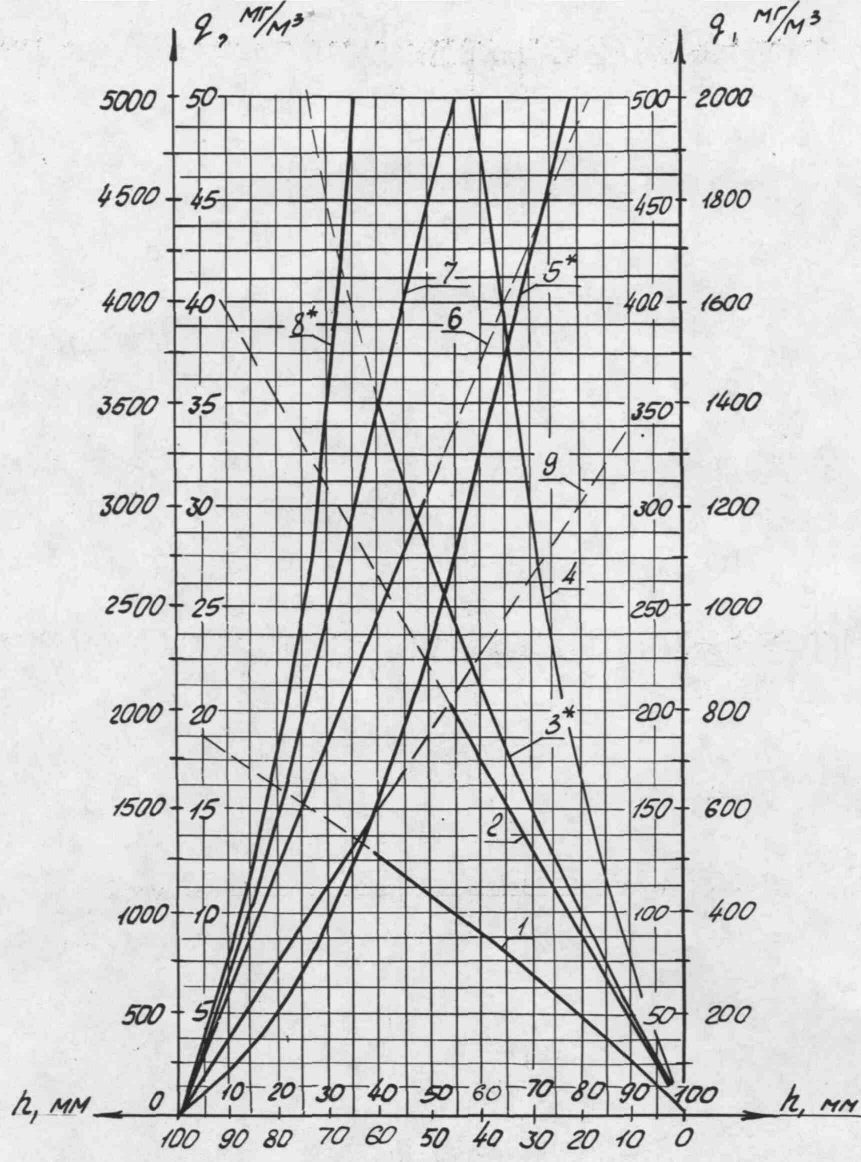 Концентрация ВВ в исследуемом загрязненном воздухе устанавливается следующим образом. Величина h окрашенного порошка в трубке измеряется по линейке 15 на стенде методом наложения. Полученный результат в мм переносится на соответствующий график рис.6 (в нашем варианте график 3*) и по графику определяется концентрация q , мг/м3