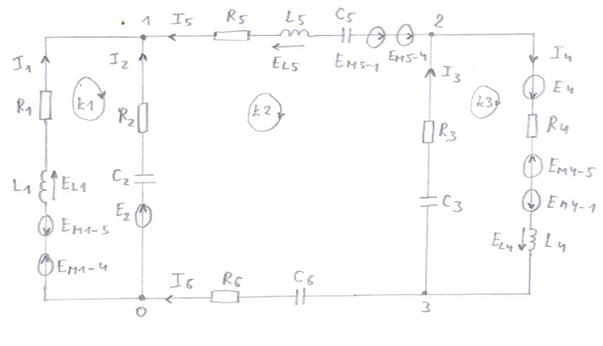 1) Запишем систему уравнений, составленных непосредственно для контурных токов(рассматривая напряжение на каждом элементе как сумму падений напряжений от каждого контурного тока)