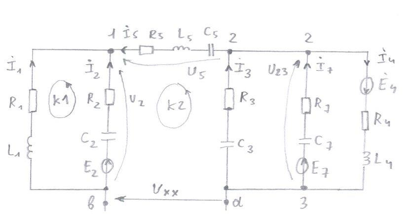 Добавим в схему седьмую ветвь с параметрами второй ветви, имеющей источник ЭДС. Данную ветвь подключим параллельно k-й ветви, где число k = 3. Расставим стрелки условно-положительных направлений токов и напряжений, а также обозначим узлы схемы цифрами: