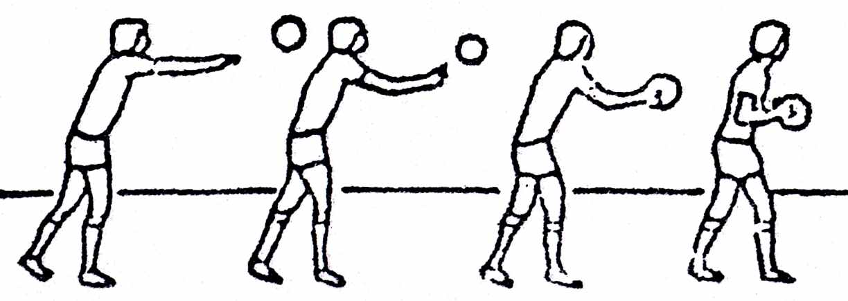 Ловля мяча выполняется на месте и с выходом навстречу летящему мячу. Передача мяча двумя руками от груди с места, с шагом. Ловля и передача мяча одной рукой с места и в движении (рис. 2-6).