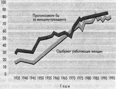 ■ Рис. 11-4. Предрассудки против женщин: идея, время которой ушло? Процент американцев, сказавших, что они одобряют замужних женщин,работающих сцелью заработать деньги, имея трудоспособных мужей, а также тех, кто намеревался проголосовать за жешцину — кандидата в президенты, неизменно увеличивается.начипая с середины 1930-х годов. (По данным Nicmi & others, 1989; Tom Smith, личная переписка)