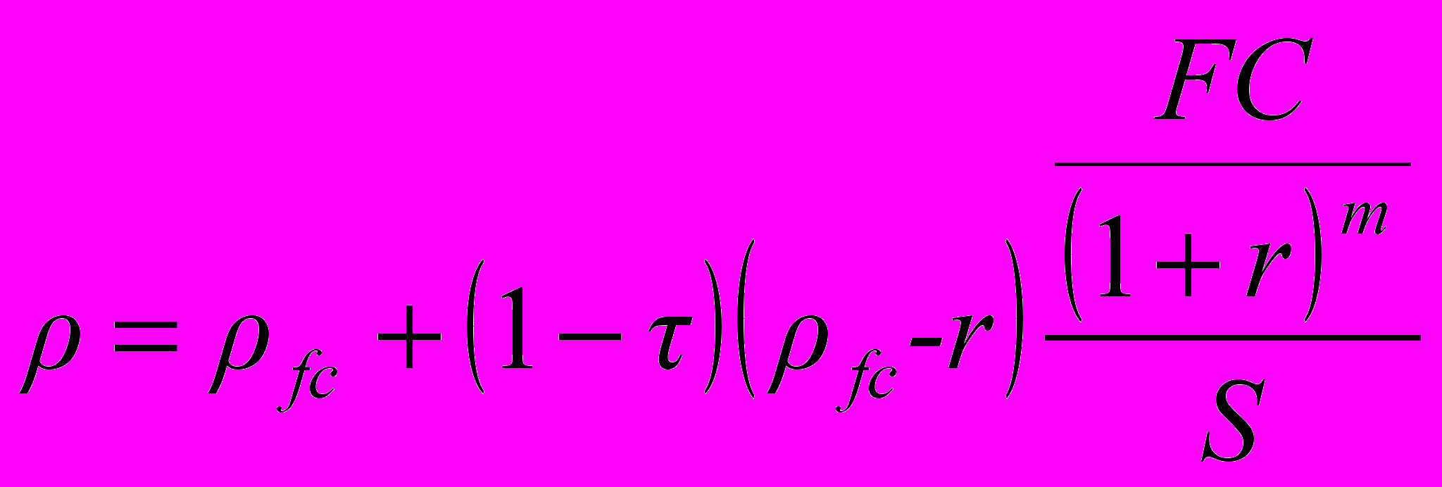 является частным случаем предлагаемой нами формулы (10), и справедлива, когда ρfc=r. В этом случае, однако, эффект операционного рычага ((1-τ)*(ρfc-r)*FC/(r*S)) равен нулю, точно так же, как и эффект финансового рычага, поскольку из равенства ρfc=r следует равенство ρ=r, и выражение ((1-τ)*(ρ-r)*D/S), соответствующее эффекту финансового рычага, равно нулю.