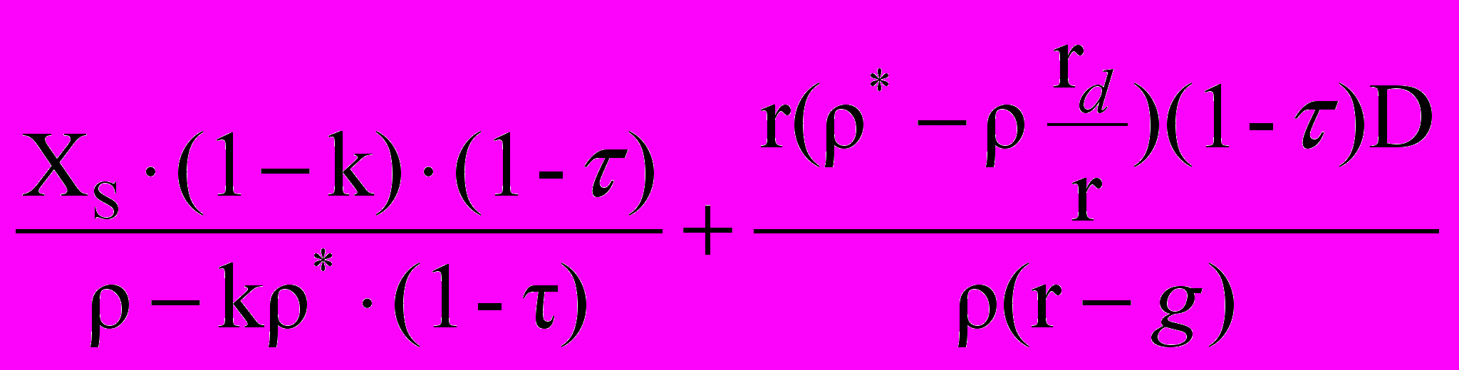 является частным случаем предлагаемой нами формулы (9), и справедлива, когда ρ = r, а долг привлекается на неограниченное время. В этом случае, однако, эффект финансового рычага ((1-τ)*(ρ-r)*D/S) равен нулю.