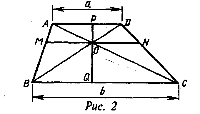 Пусть РQ высота трапеции. Из подобия треугольников АОD и СОВ следует, что РО : а = OQ : b. Или РО : а == (РQ — РО) : b. Отсюда легко получить, что РО = РQ • а : (а + b). Из подобия треугольников АВС и АМО следует пропорция РО : РQ = МО : b. А значит, МО = a • b: (а + b). То же самое вычисление действительно и для ОN.
