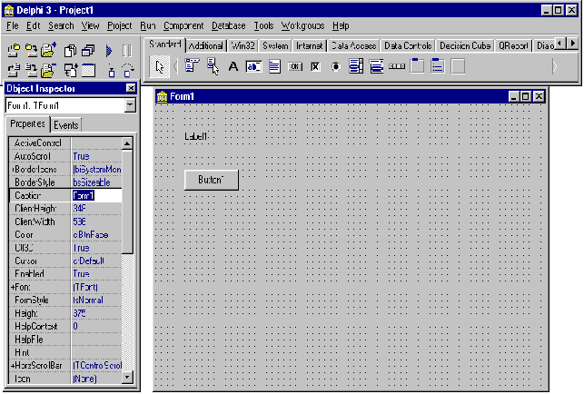 Слева от Дизайнера Форм Вы можете видеть Инспектор Объектов. Любой размещаемый на форме компонент характеризуется некоторым набором параметров: положением, размером, цветом и т. д. Часть этих параметров, например, положение и размеры компонента, программист может изменять, манипулируя с компонентом в окне формы. Для изменения других параметров предназначено окно Инспектора объектов. Это окно содержит две страницы – Properties (Свойства) и Events (События). Страница properties служит для установки нужных свойств компонента, страница Events позволяет определить реакцию компонента на то или иное событие. Совокупность cвойств отображает видимую сторону компонента: положение относительно левого верхнего угла рабочей области формы, его размеры и цвет, шрифт и текст надписи на нем и т. п.; совокупность событий - его поведенческую сторону: будет ли компонент реагировать на щелчок мыши или на нажатие клавиш, как он будет вести себя в момент появления на экране или в момент изменения размеров окна и т. п. Каждая страница окна Инспектора объектов представляет собой двухколончатую таблицу, левая колонка которой содержит название свойства или события, а правая – конкретное значение свойства или имя подпрограммы [Если вам еще не знаком этот термин, считайте, что подпрограмма – это просто относительно небольшой фрагмент программы.], обрабатывающей соответствующее событие. В верхней части окна Инспектора объектов располагается раскрывающийся список всех помещенных на форму компонентов. Поскольку форма сама по себе является компонентом, ее имя также присутствует в этом списке.