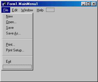оместите на форму компонент MainMenu (закладка Standart на Палитре компонентов). Вызовите Дизайнер Меню, дважды щелкнув мышкой по компоненту на форме. Затем создайте меню как показано на рисунке.Для создания подменю можно воспользоваться командой Create SubMenu в контекстном меню, которое вызывается правой кнопкой мыши. После разработки закройте Дизайнер Меню. В верхней части формы теперь можно видеть разработанное меню.