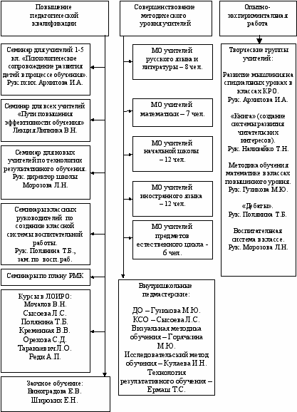 Методическая работа последние пять лет была направлена на повышение эффективности работы школы. Для внедрения новых педагогических идей была организована следующая работа: