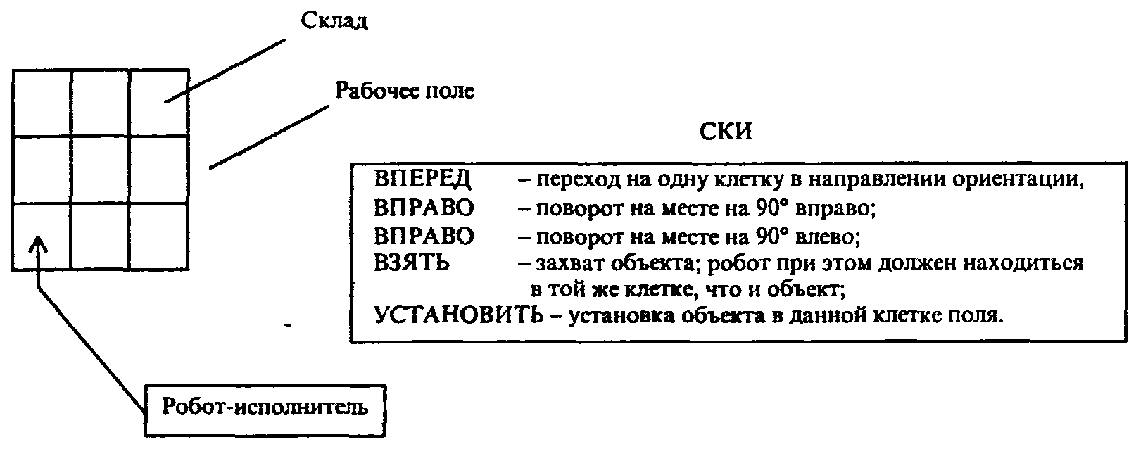 В качестве примера (рис.1.11) рассмотрим исполнителя-робота, работа которого состоит в собственном перемещении по рабочему полю (квадрату произвольного размера, разделенному на клетки) и перемещении объектов, в начальный момент времени находящихся на «складе» (правая верхняя клетка).