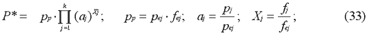 где P* — рыночная стоимость (равновесная цена); fj — элемент сравнения; fj и fej — количественные характеристики j-гo фактора сравнения соответственно для любого объекта сравнения и для некоторого специально подобранного «эталонного» объекта; pj = Pfj/fj – удельная характеристика ценности фактора единицы измерения, где Pfj — цена j-гo фактора размером fj.
