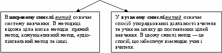 Методи навчання дають відповідь на запитання "Як навчати?" Поняття "метод" означає шлях до поставленої мети. В сучасній методиці навчання іноземних мов метод трактується в широкому і вузькому смислі.