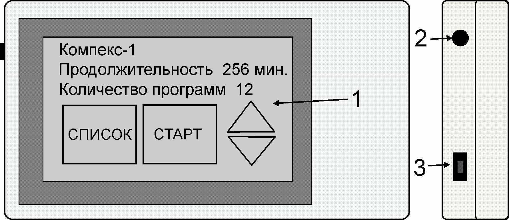2. На дисплее прибора отобразится следующая информация: название комплекса, длительность комплекса с учетом пауз между программами, количество программ в комплексе, значки перебора комплексов (в виде стрелок ( ),