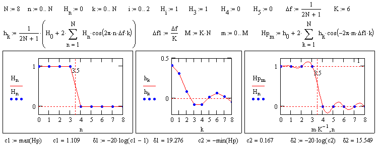 В основе метода лежит непосредственное задание частотной характеристики фильтра в цифровой форме с последующим подбором переходных зон под требуемые характеристики фильтра по величине допустимых осцилляций в полосе пропускания и подавления. Расчет желательно вести в интерактивном режиме, например, в среде Mathcad. В качестве примера приведем расчет низкочастотного фильтра.