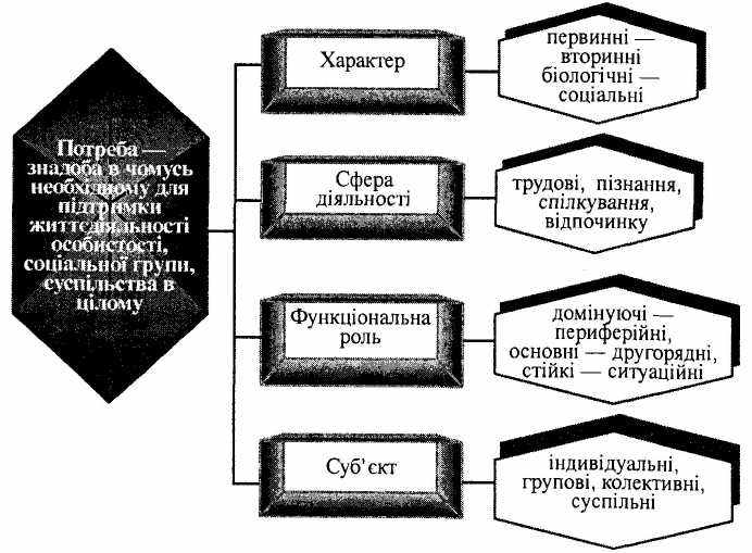 Потреби є основою діяльності людини, її внутрішнім спонукальним мотивом. Зміст потреб визначається як особистісними оцінками, критеріями, установками і цінностями людини, так і об'єктивними умовами її життєдіяльності, рівнем розвитку економіки, культури.