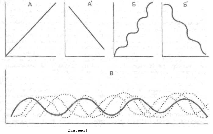 Во-первых, статистика доходов в США, Великобритании, Германии, Франции, Дании, России и некоторых других стран показывает, что со второй половины XIX века там существует тенденция к увеличению среднего уровня дохода и благосостояния. Допуская, что расчеты верны, встает вопрос, является ли эта тенденция постоянной (или она только часть "параболы"), которую может вытеснить стагнация или даже движение в противоположном направлении? Вторая возможность оказывается более верной. Если представить экономическое развитие во времени схематично, то это не будет ни прямая линия (А), ни спираль (Б), восходящая или постоянно нисходящая. Оно скорее ближе к изображению (В), которое не имеет какого-либо постоянного направления (см. диаграмма 1).