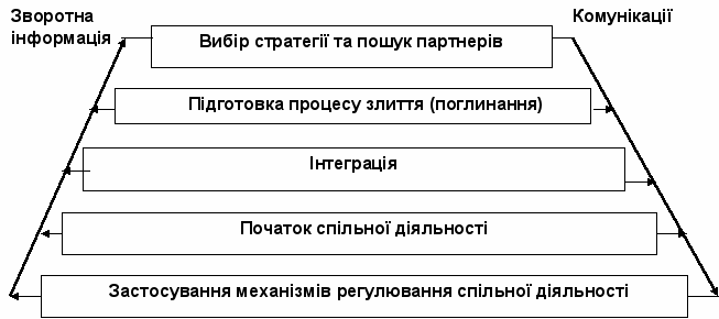 1. Вибір стратегії та пошук партнерів. Визначаються основні стратегічні цілі, що може досягнути компанія через злиття (поглинання). Слід розрізняти декілька етапів: